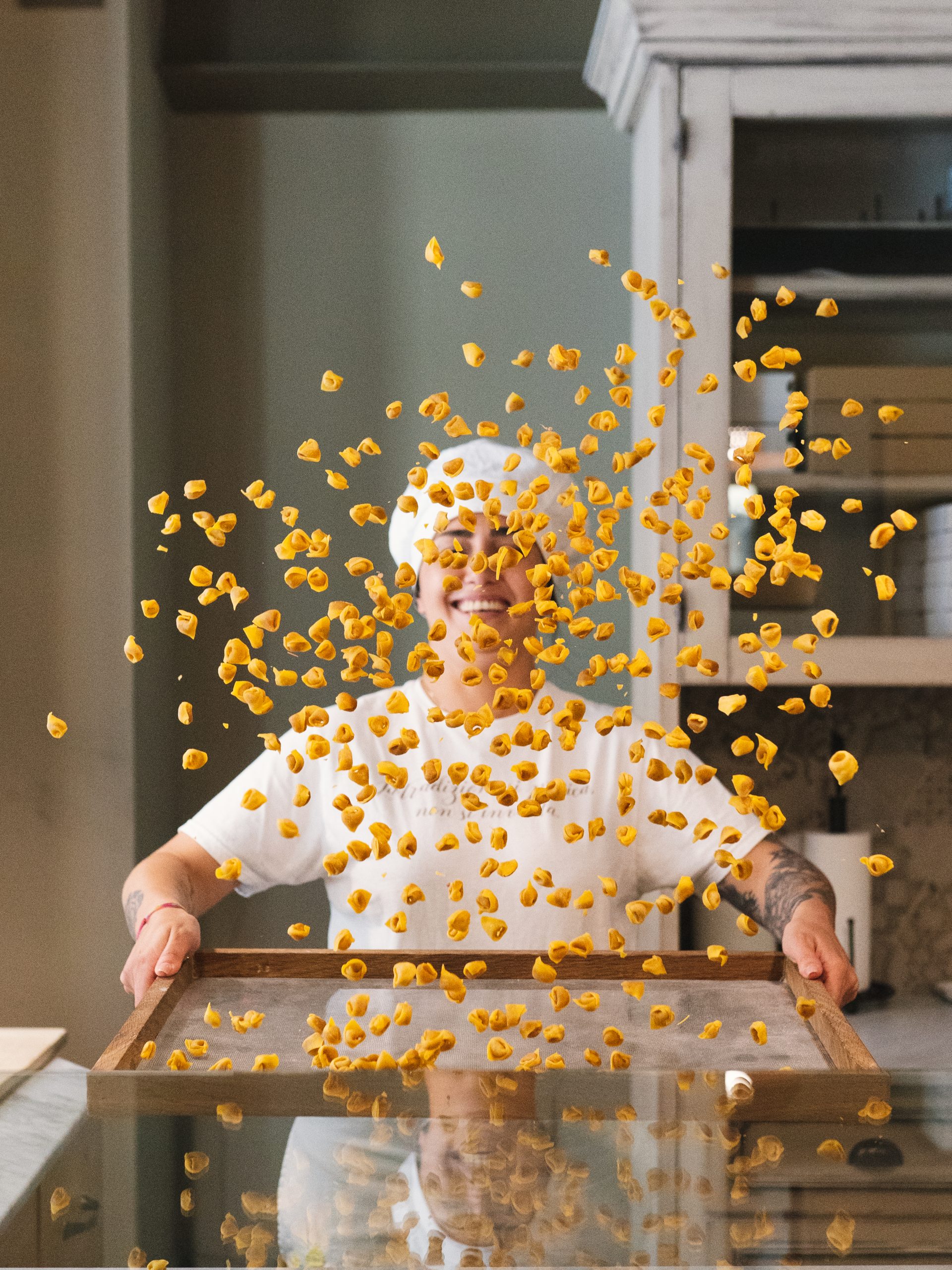 Ogni giorno le nostre sfogline tirano la pasta a mano con il matterello.